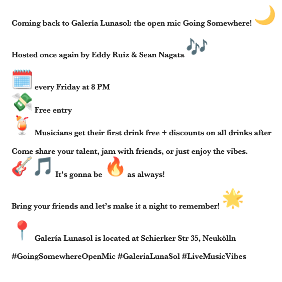 «Galería Lunasol» en Berlin-Neukölln. Arte latinoamericano – Pintura, trabajo manual, Workshops, Cursos de Pintura y Escultura, Musicá y Comida bio-vegana. Organización de eventos y Catering en Berlin y Brandenburg. Eventos y Conciertos.